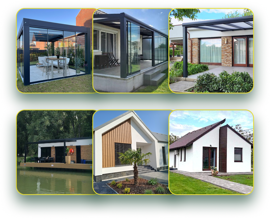 Négyévszakos, kényelmes élettér alumínium terasszal kiegészítve. Harmonikus elrendezésével családi háznak, irodának vagy nyaralónak is ideális.
