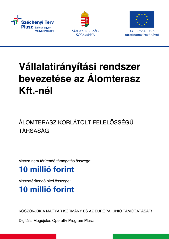 Az Álomterasz Kft, mint dinamikusan fejlődő magyarországi KKV a DIMOP (Digitális Megújulás Operatív Program Plusz) pályázatban megfogalmazott célokkal azonosulva a digitális fejlődését tűzte ki célul, mely közvetve hozzájárul a versenyképesség javításához is.